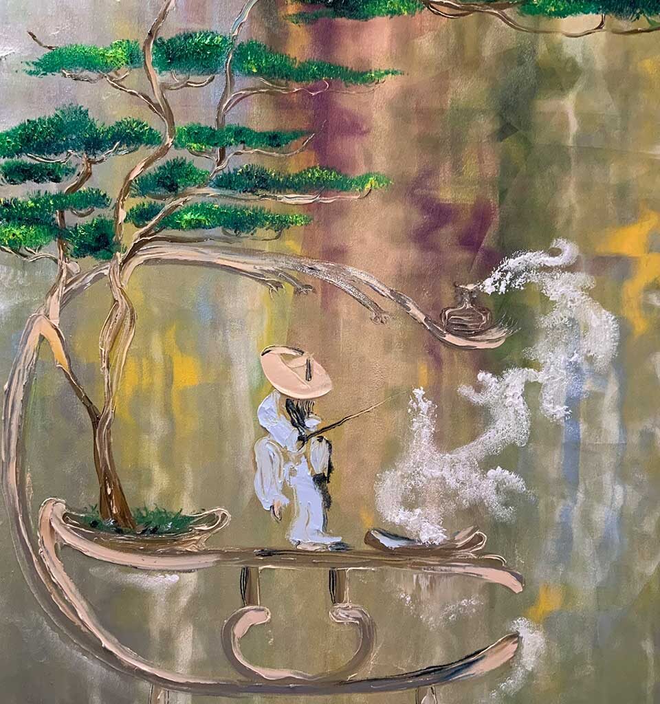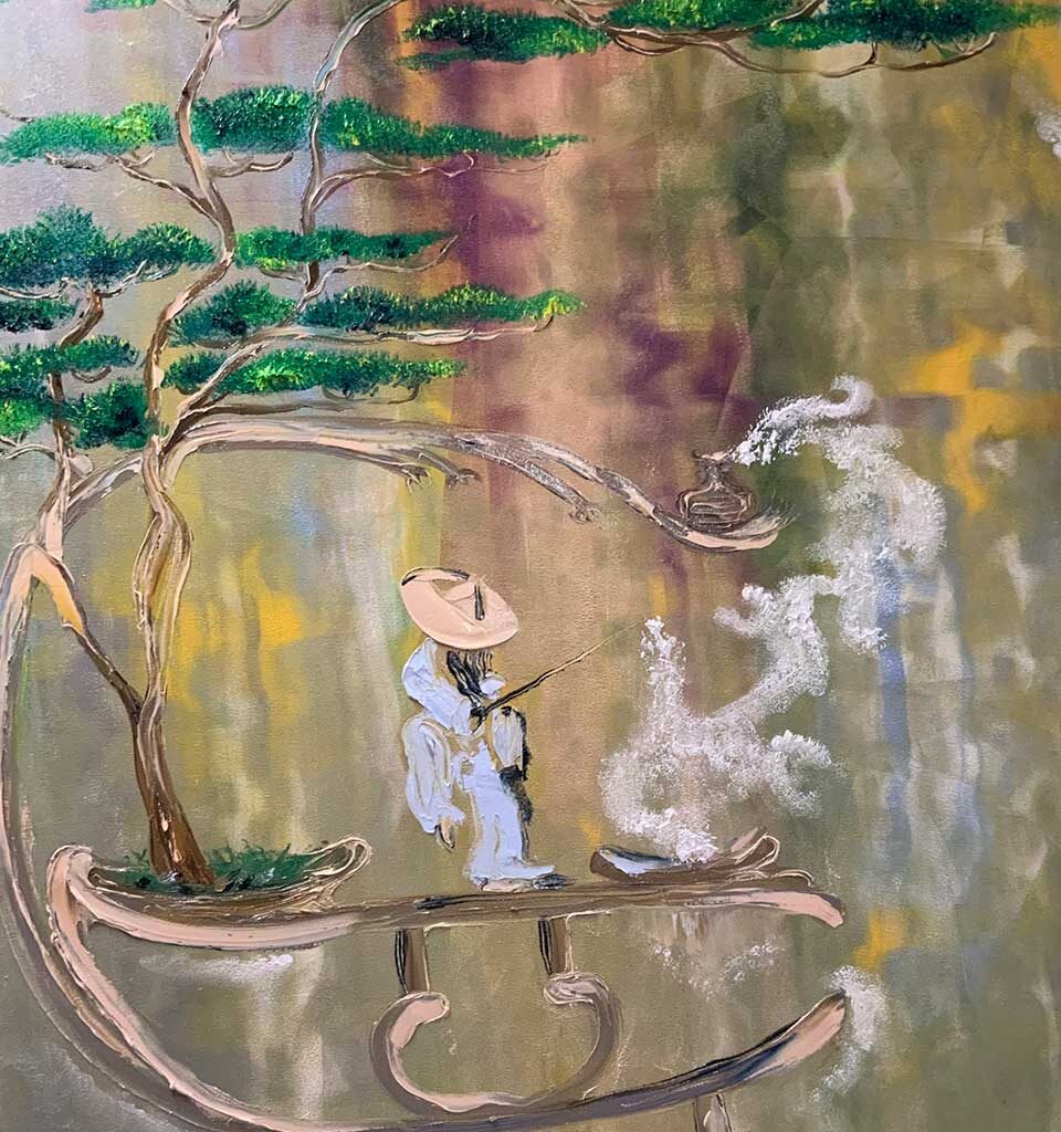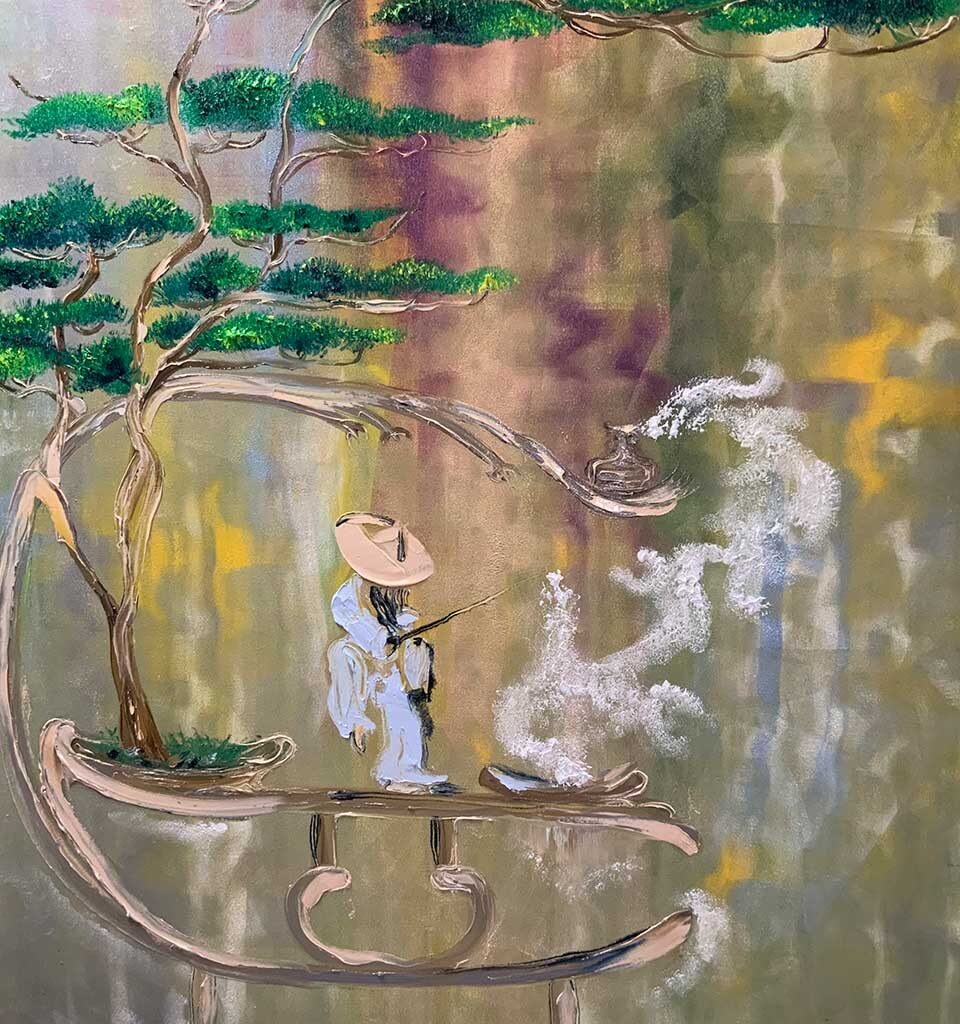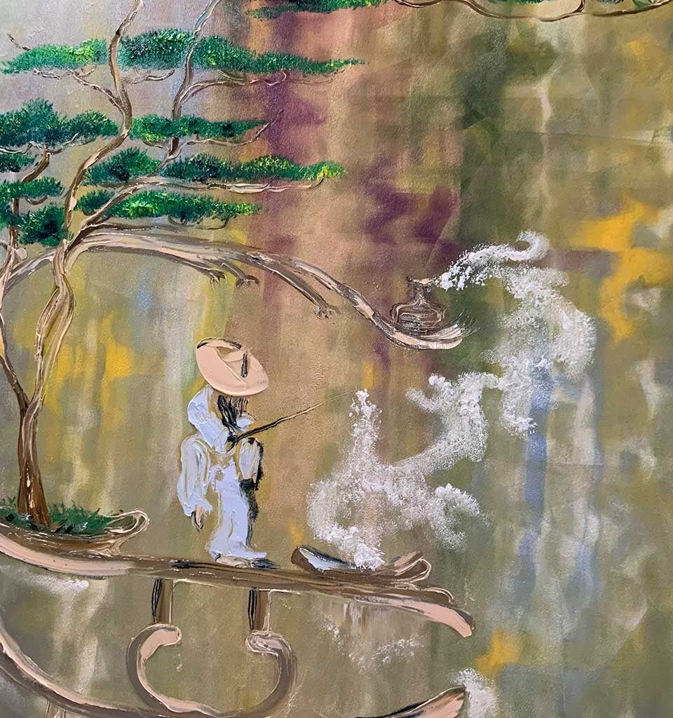 мудрец во время ритуального танца с помощью трости тянет на себя дым и формирует хвост дымовому дракону; когда он закончит хвост - хозяин картины получит желаемое.