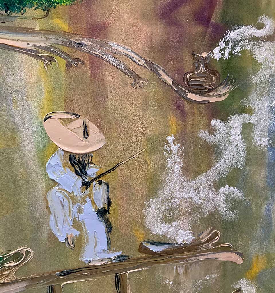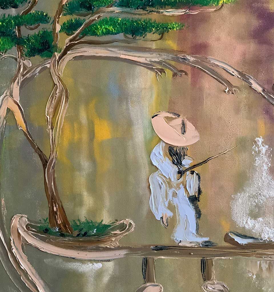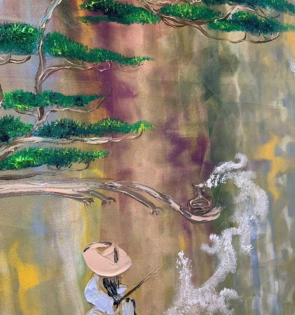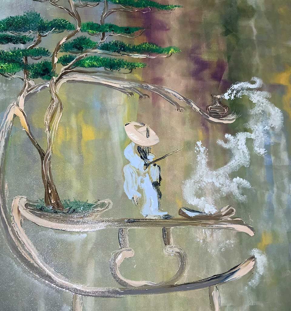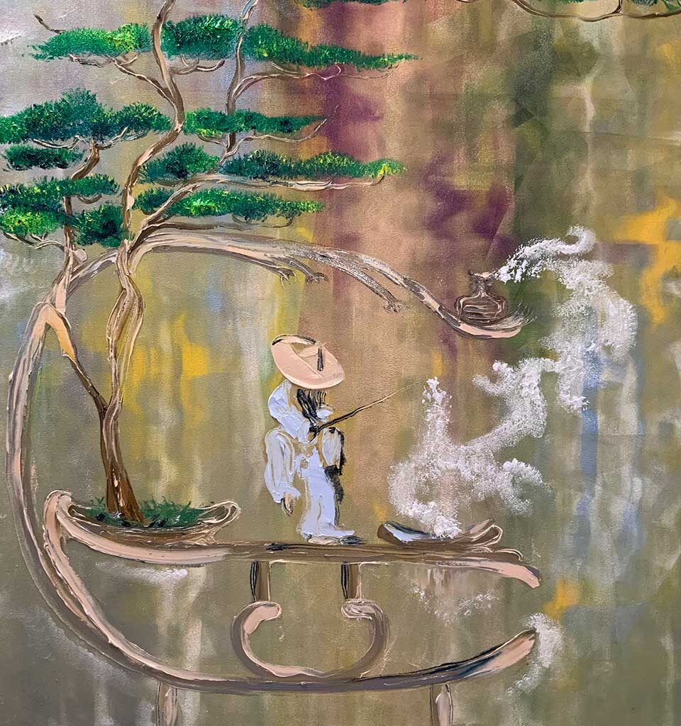мудрец во время ритуального танца с помощью трости тянет на себя дым и формирует хвост дымовому дракону; когда он закончит хвост - хозяин картины получит желаемое.