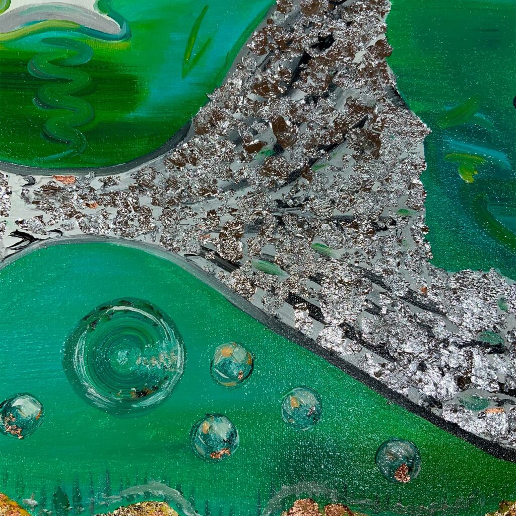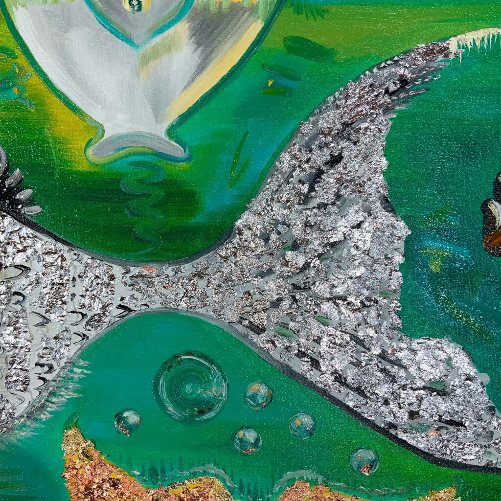 Масло. Золотая рыба - выложена ювелирным желтым золотом (паталью), серебряная - выложена натуральным листовым ювелирным серебром, вставки красноватого цвета - натуральная медь