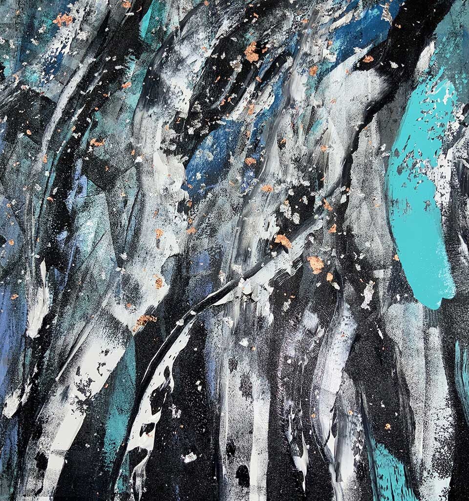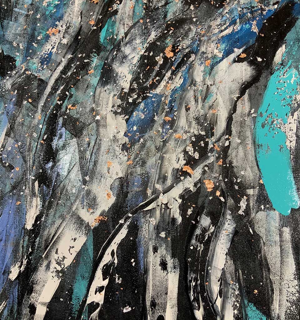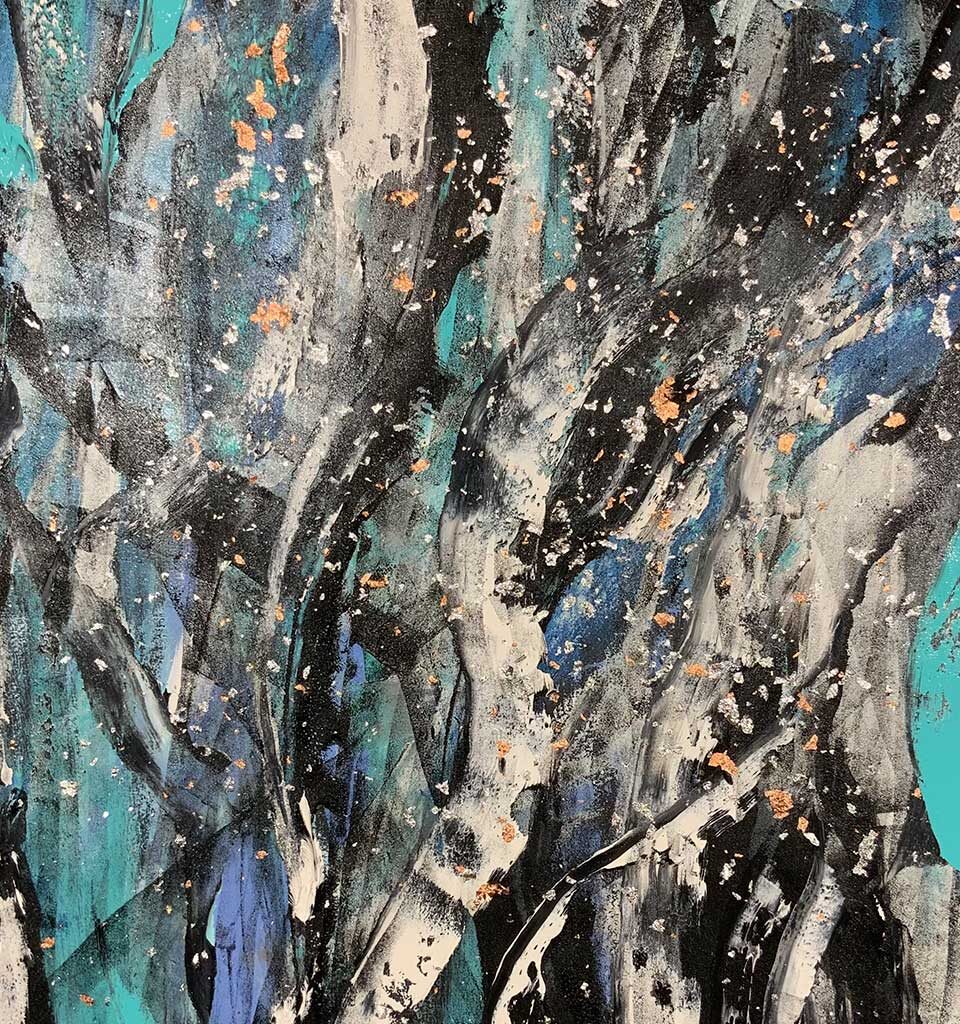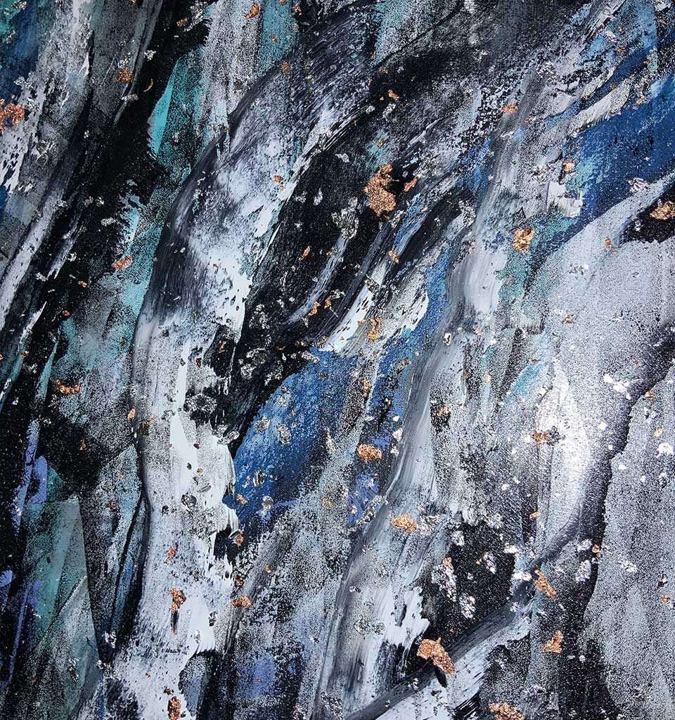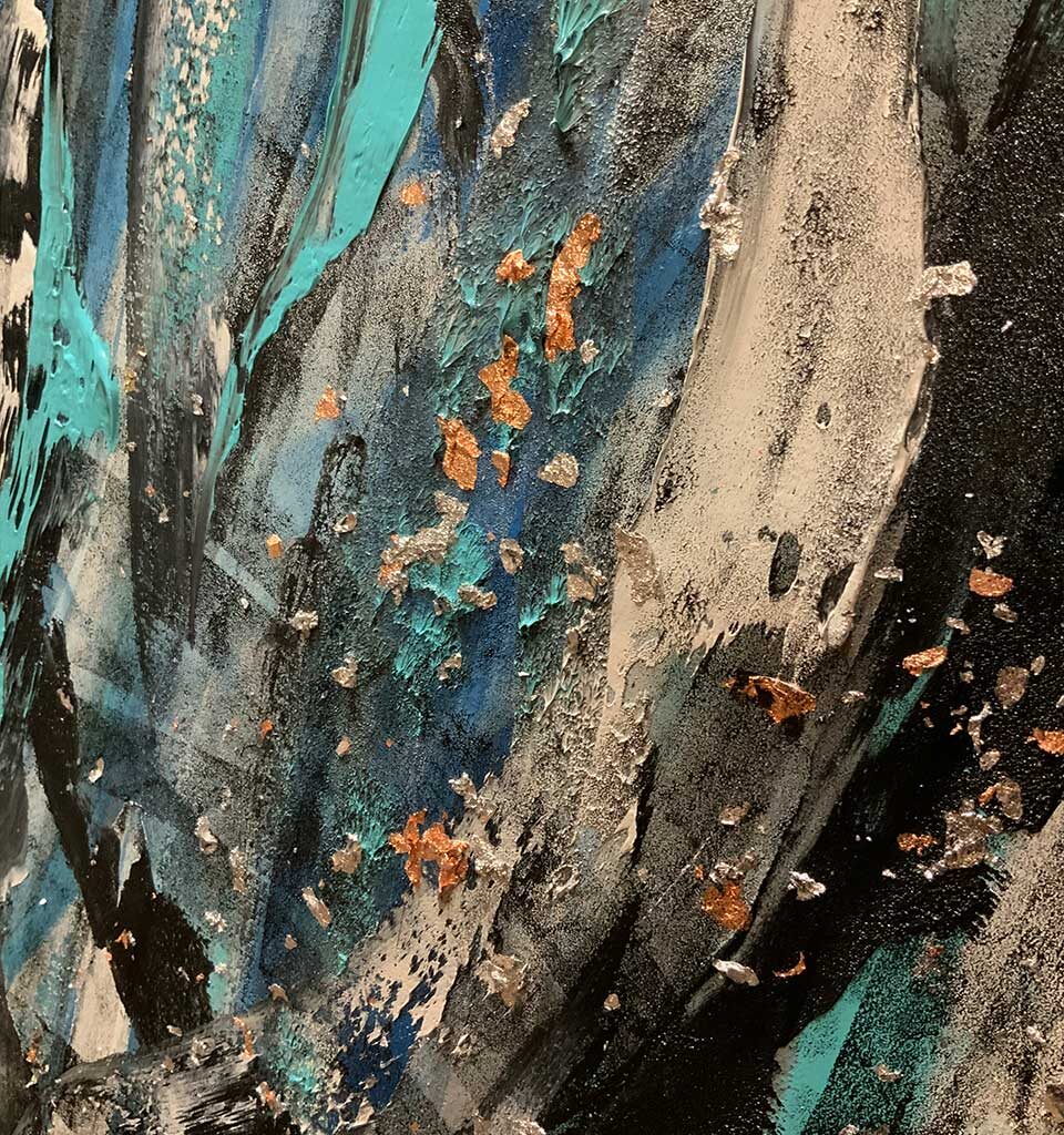 Масло. Поталь вкрапления: золото, медь и серебро. Меняет цвета в зависимости от освещения «живая» (от светлого белого до голубовато снежного синего)