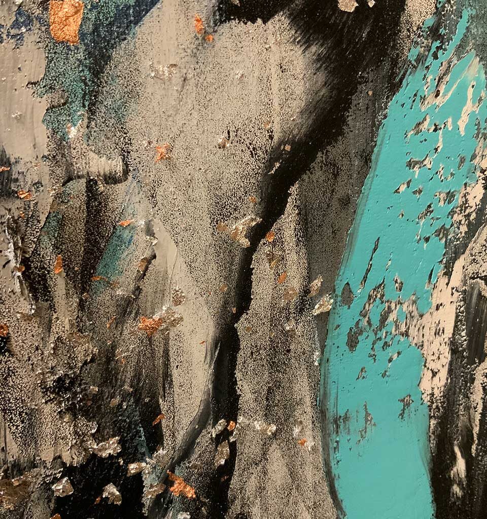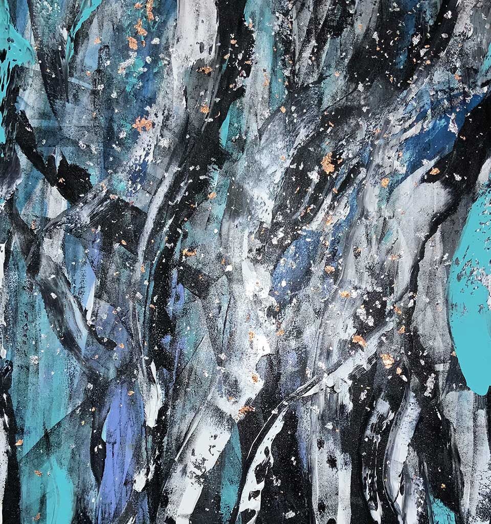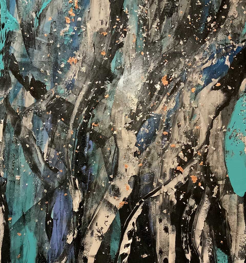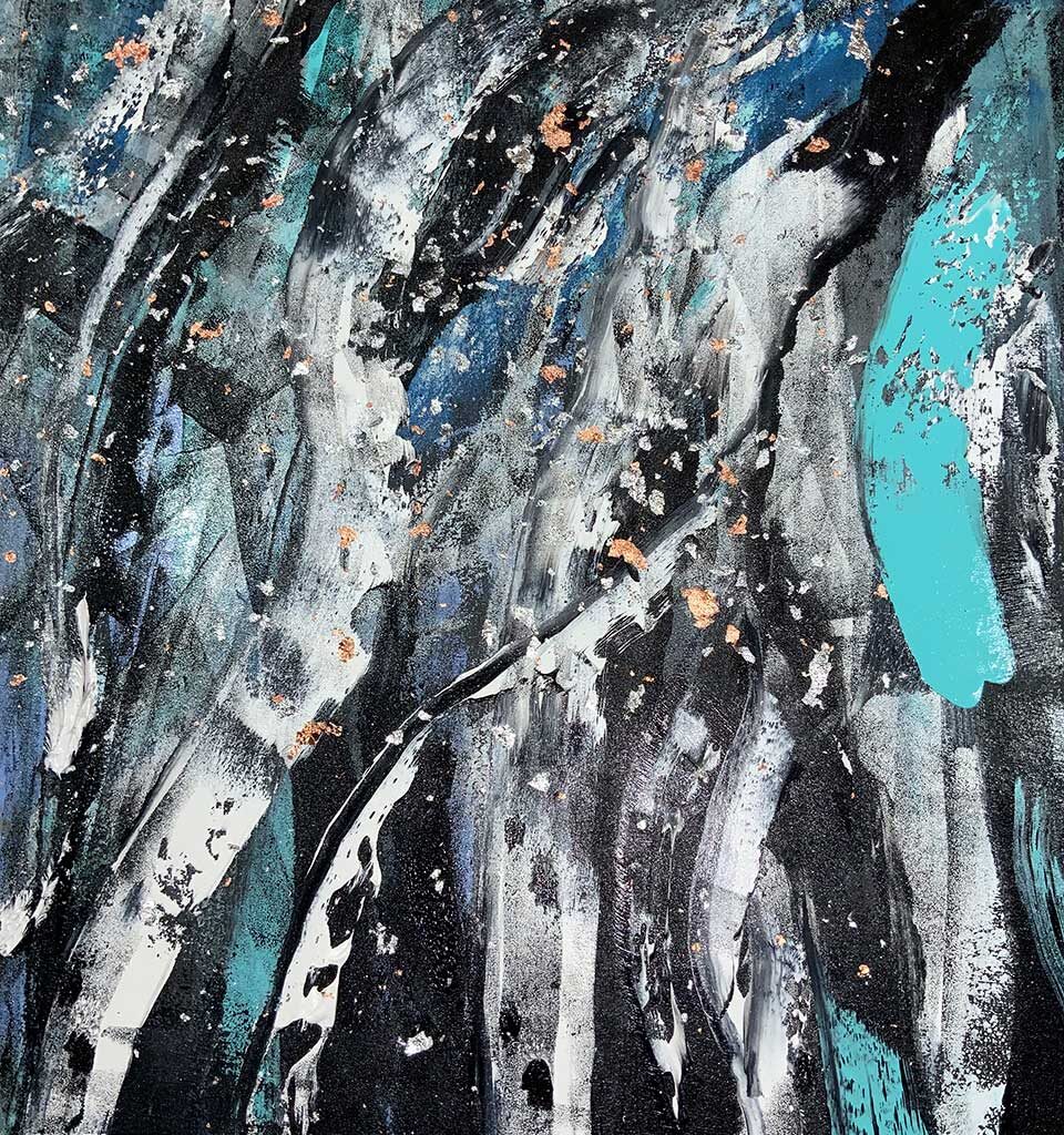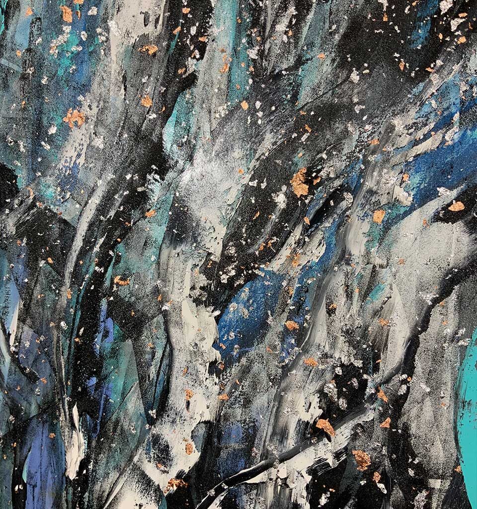 Масло. Поталь вкрапления: золото, медь и серебро. Меняет цвета в зависимости от освещения «живая» (от светлого белого до голубовато снежного синего)