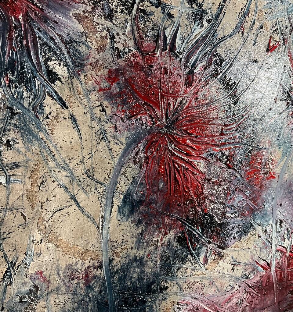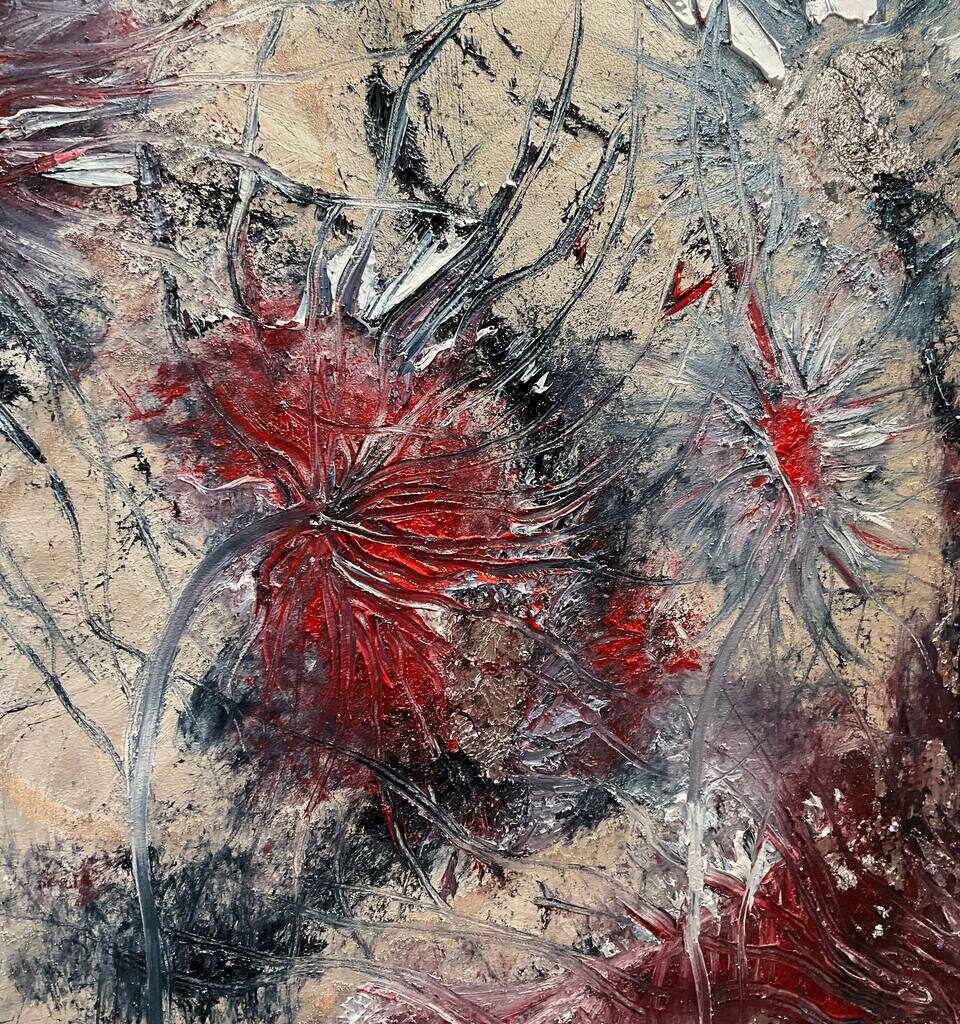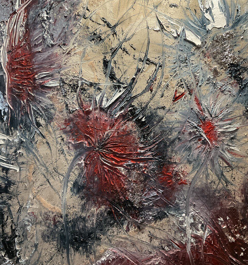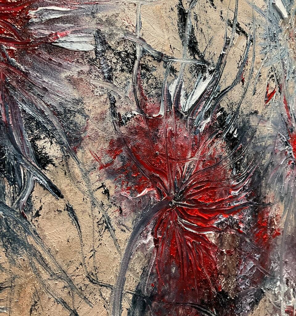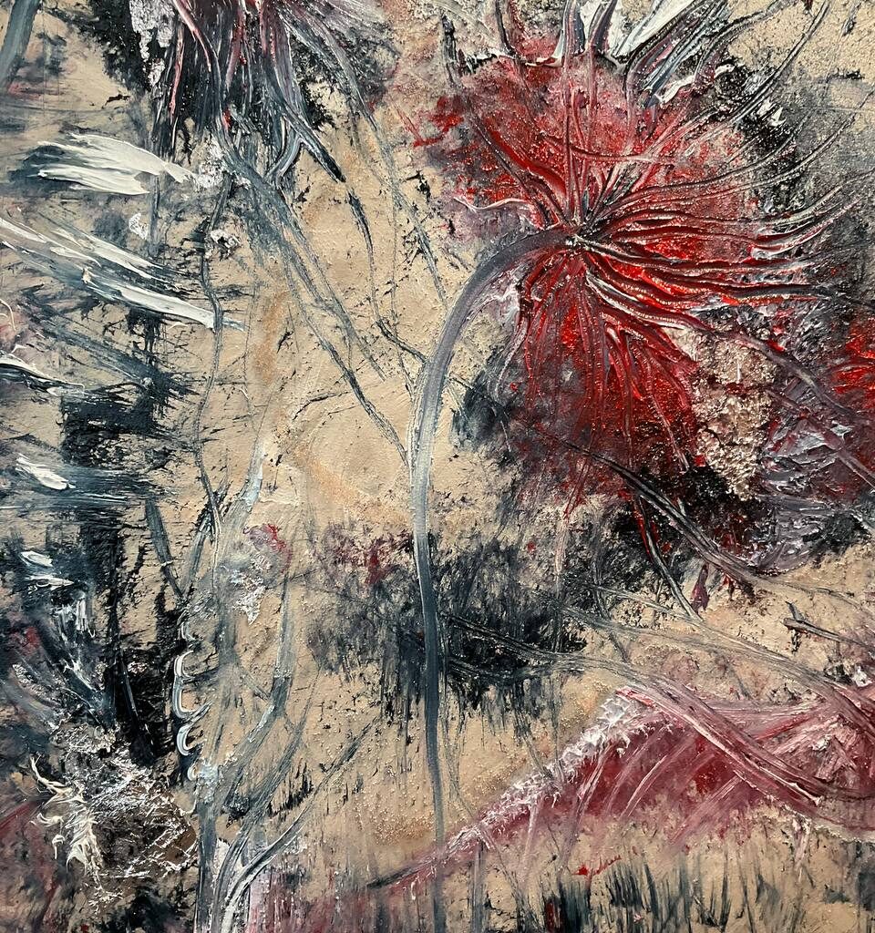 Красные цветы - хранители собственного сознания, их окружают тернии, но и горы; их окутывает неизвестность, но они поддерживают друг друга - соединяясь незримыми нитями.