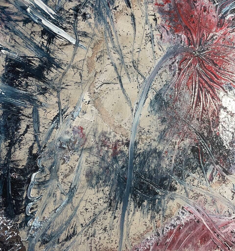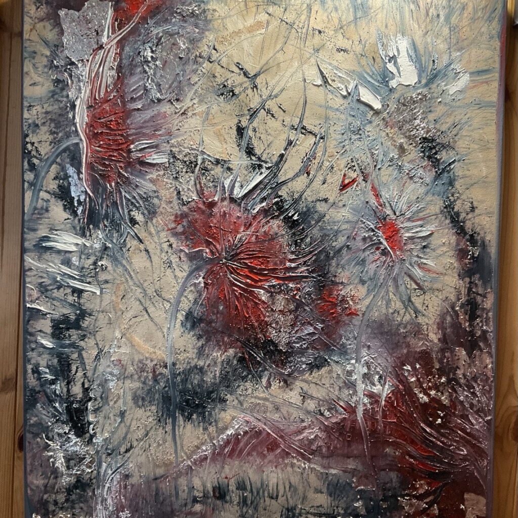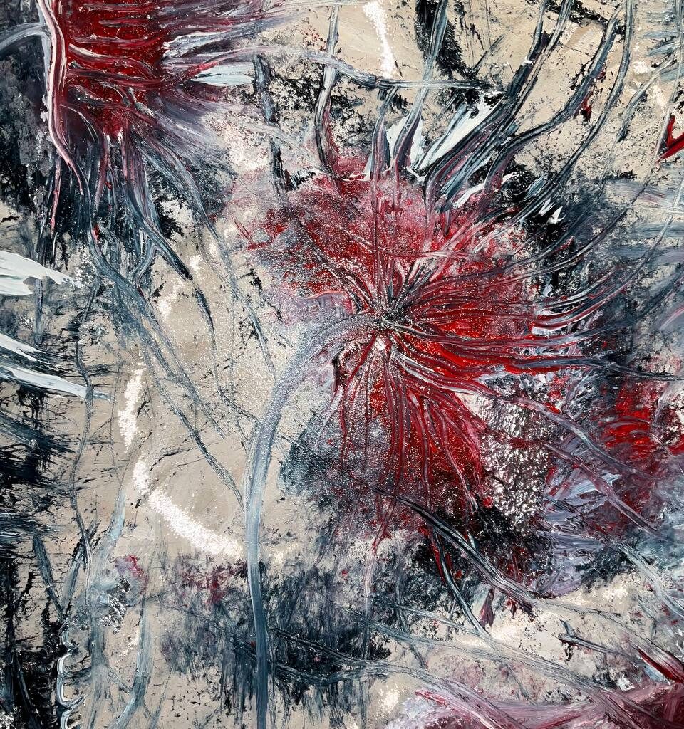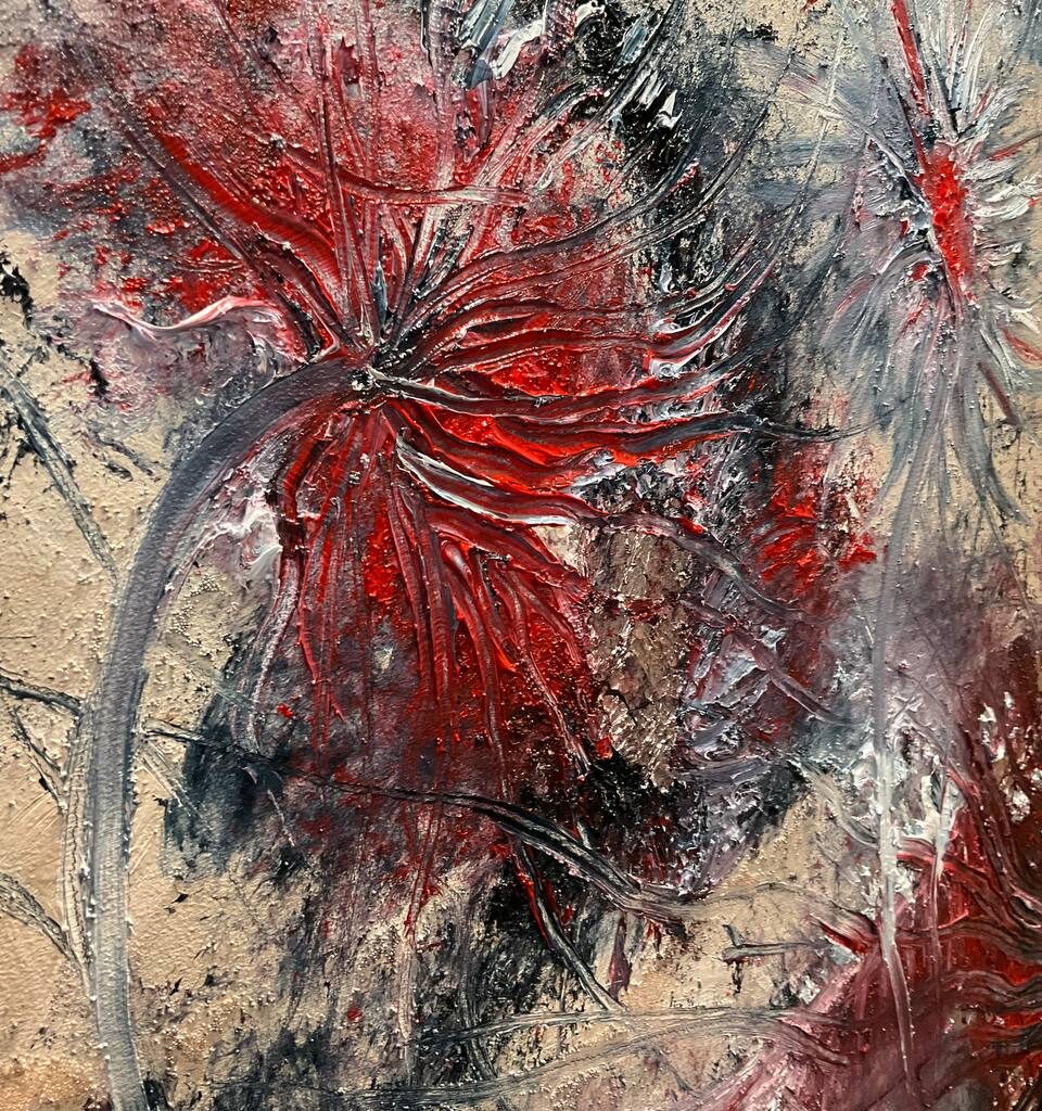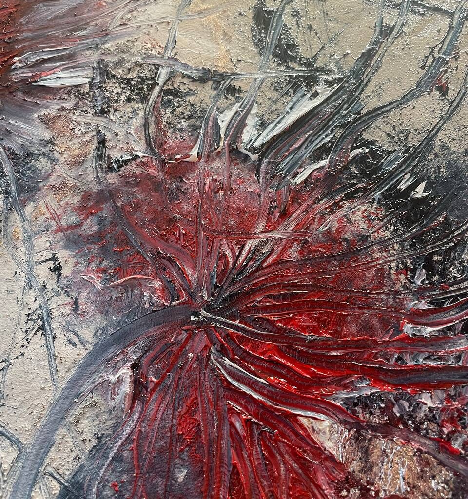 Красные цветы - хранители собственного сознания, их окружают тернии, но и горы; их окутывает неизвестность, но они поддерживают друг друга - соединяясь незримыми нитями.