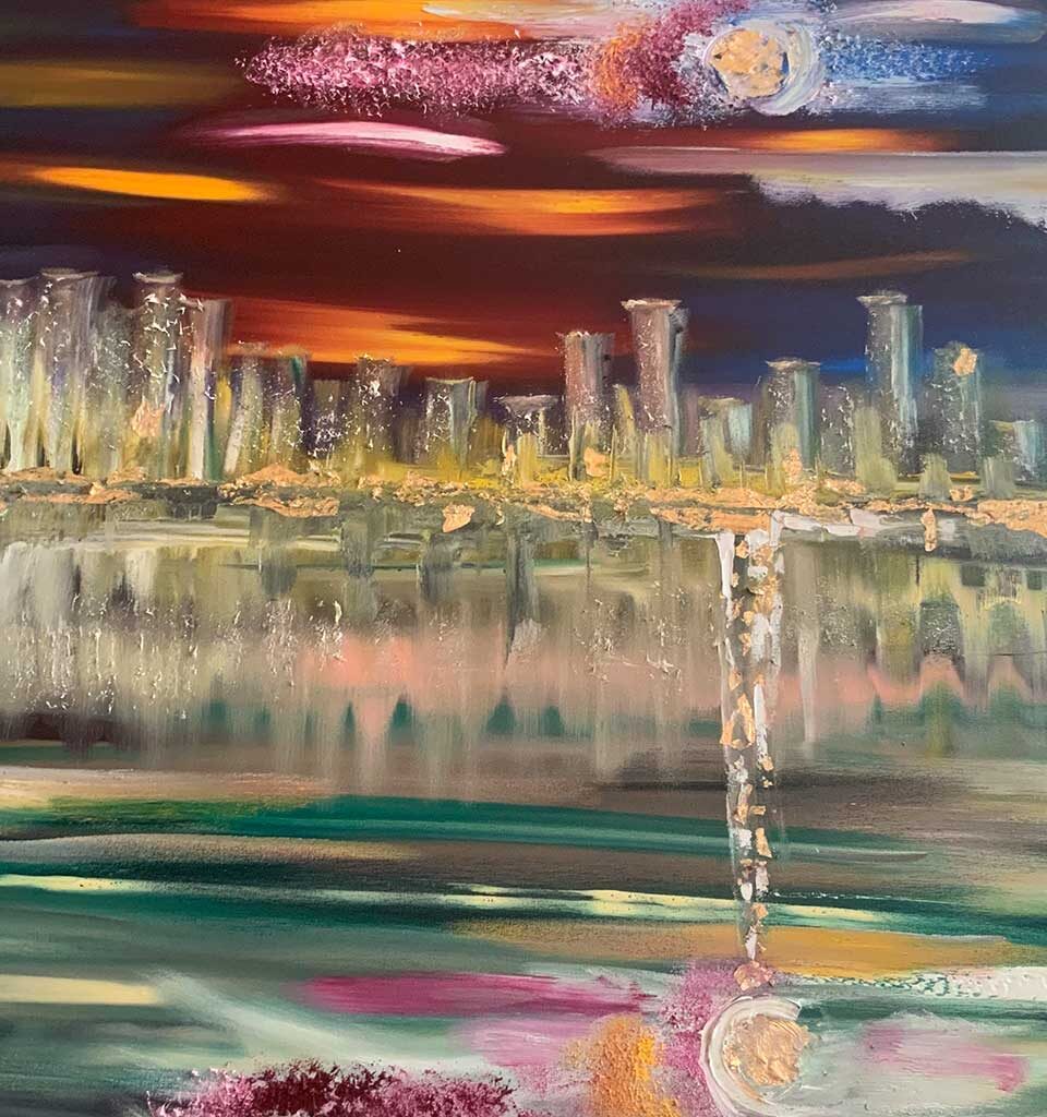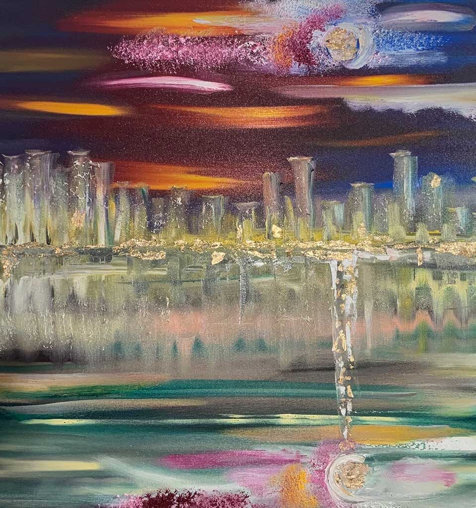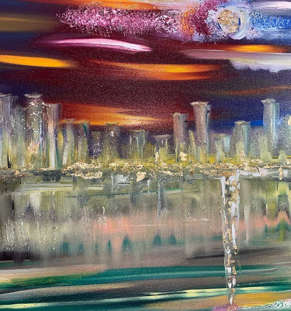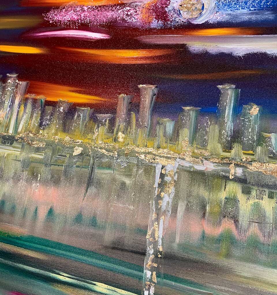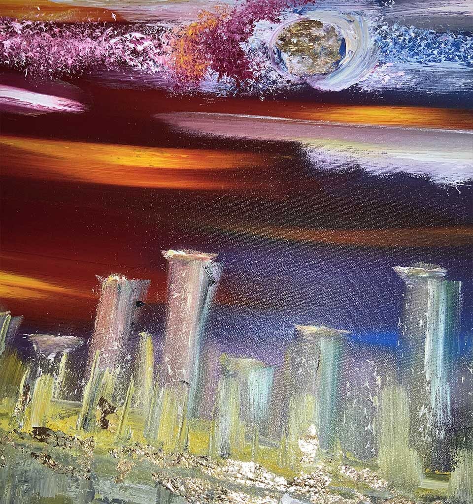 Философия картины: вечерняя Луна над большим городом, но в отражении в воде от Луны спускается золотой маятник. Он пока расположен ровно, но готов качнуться в любую сторону, что б изменить ситуацию и вытянуть на себя проблемы (иногда картину надо снимать со стены и накрывать накидкой что б она сама восстановилась).