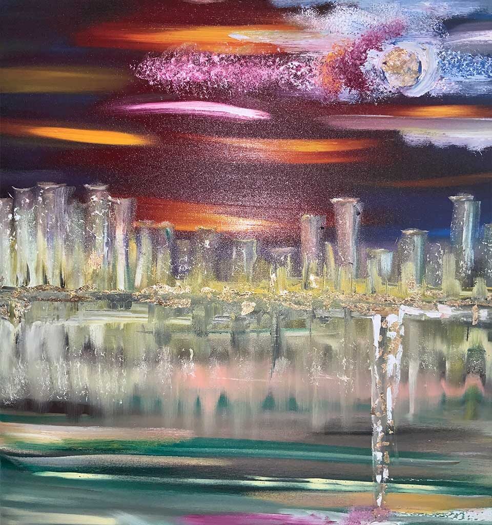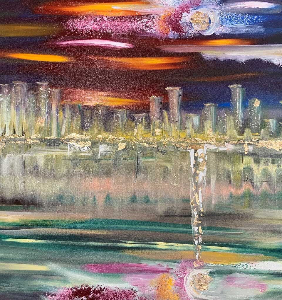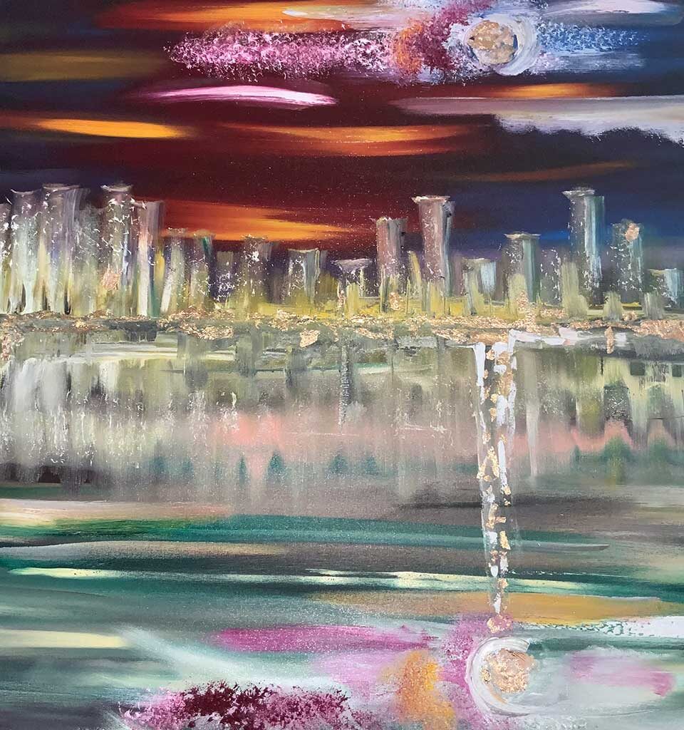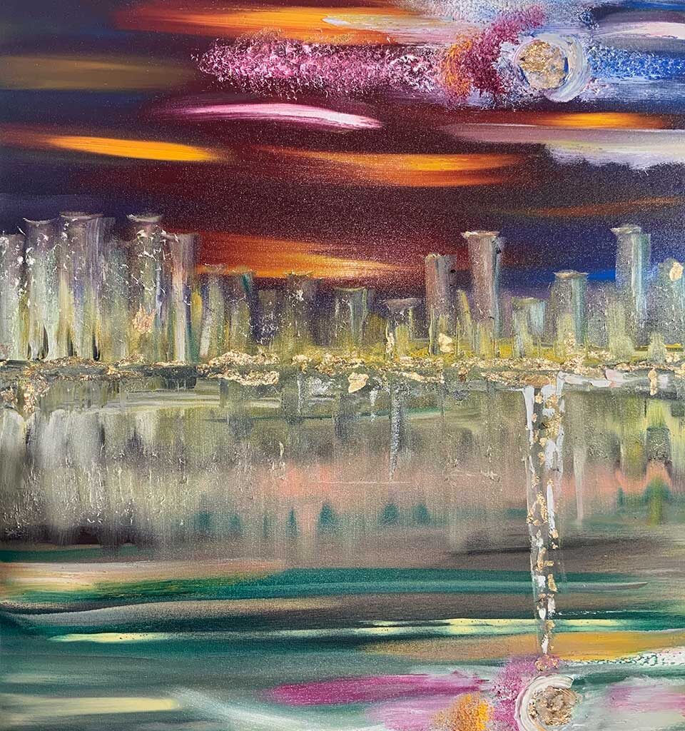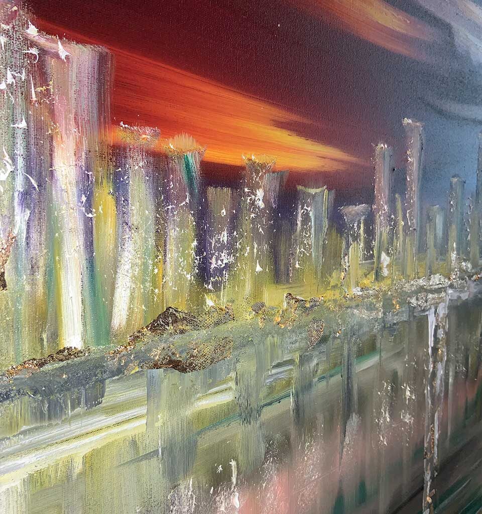 Философия картины: вечерняя Луна над большим городом, но в отражении в воде от Луны спускается золотой маятник. Он пока расположен ровно, но готов качнуться в любую сторону, что б изменить ситуацию и вытянуть на себя проблемы (иногда картину надо снимать со стены и накрывать накидкой что б она сама восстановилась).