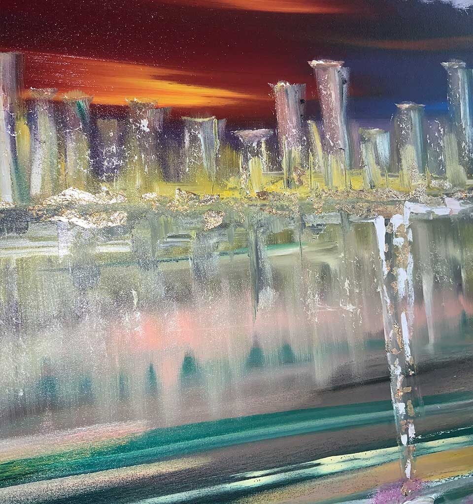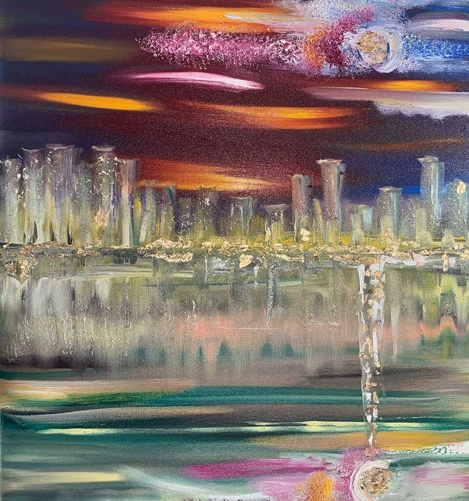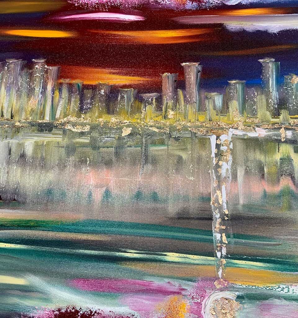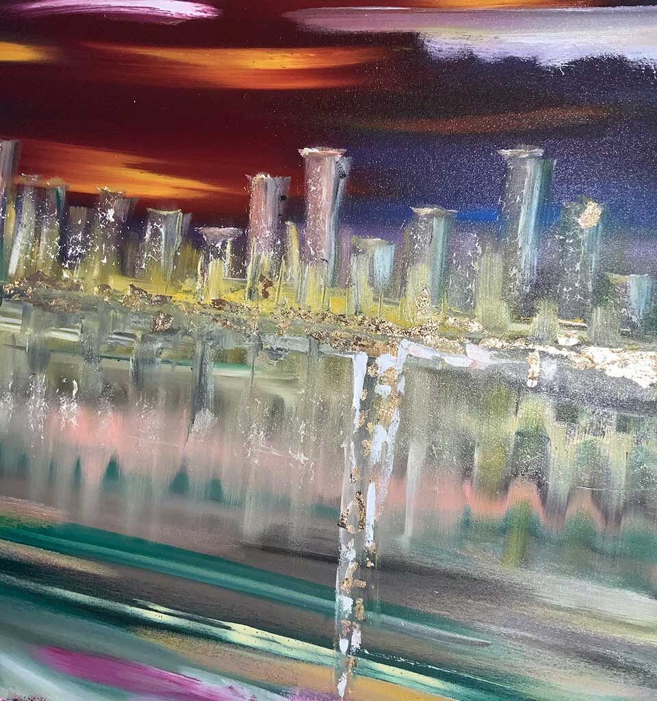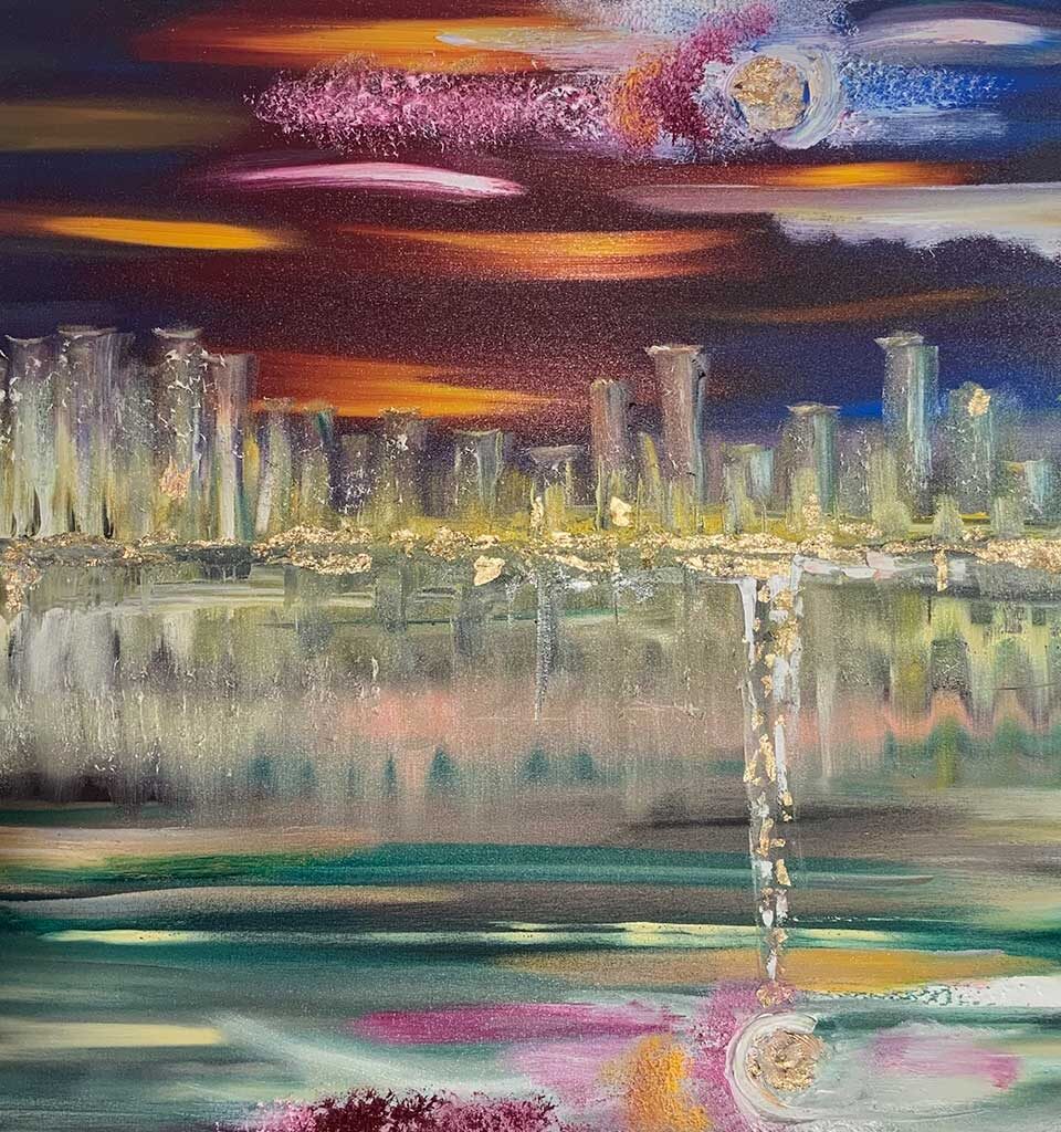 Философия картины: вечерняя Луна над большим городом, но в отражении в воде от Луны спускается золотой маятник. Он пока расположен ровно, но готов качнуться в любую сторону, что б изменить ситуацию и вытянуть на себя проблемы (иногда картину надо снимать со стены и накрывать накидкой что б она сама восстановилась).