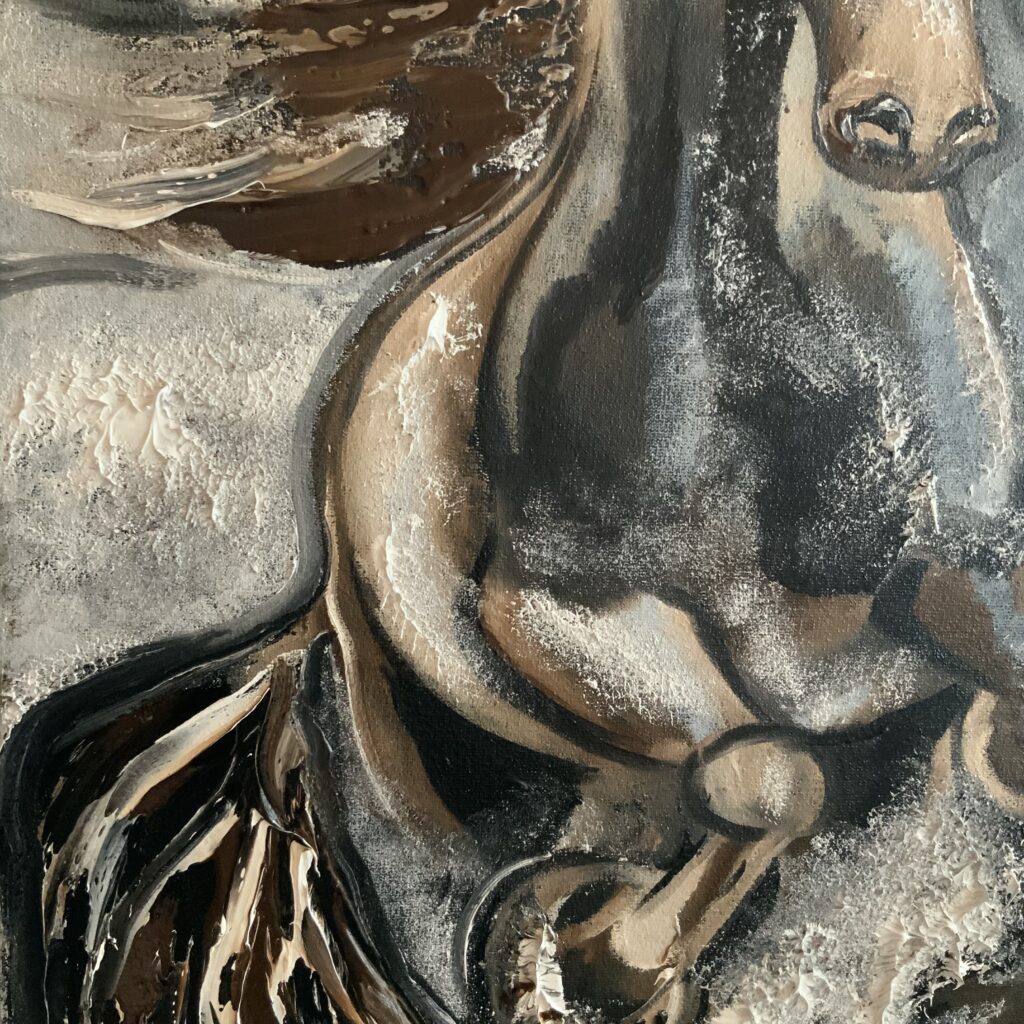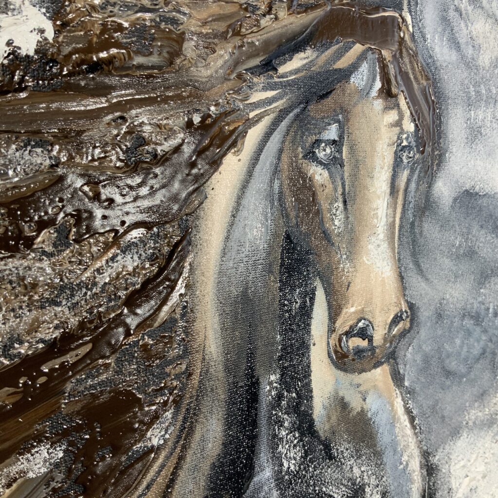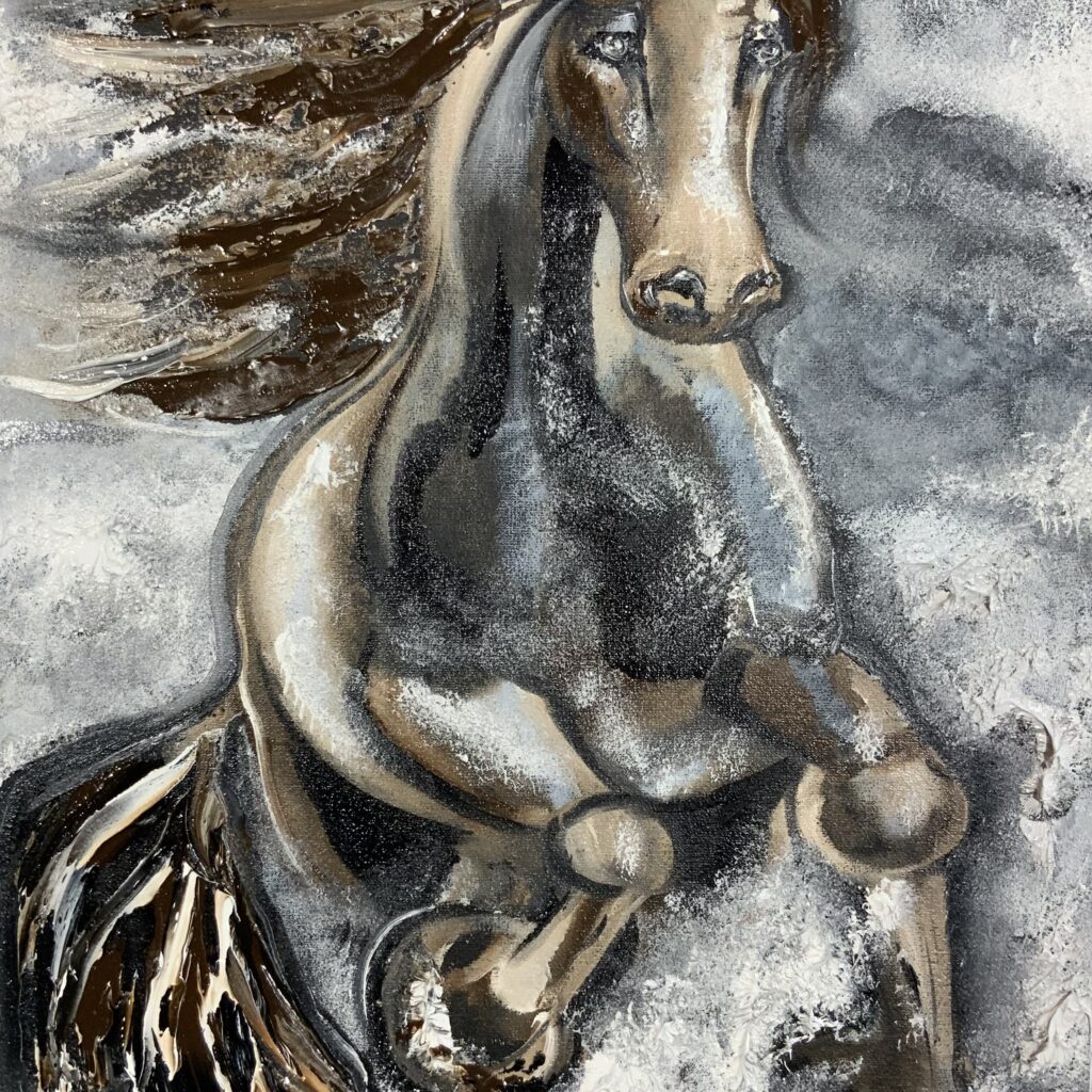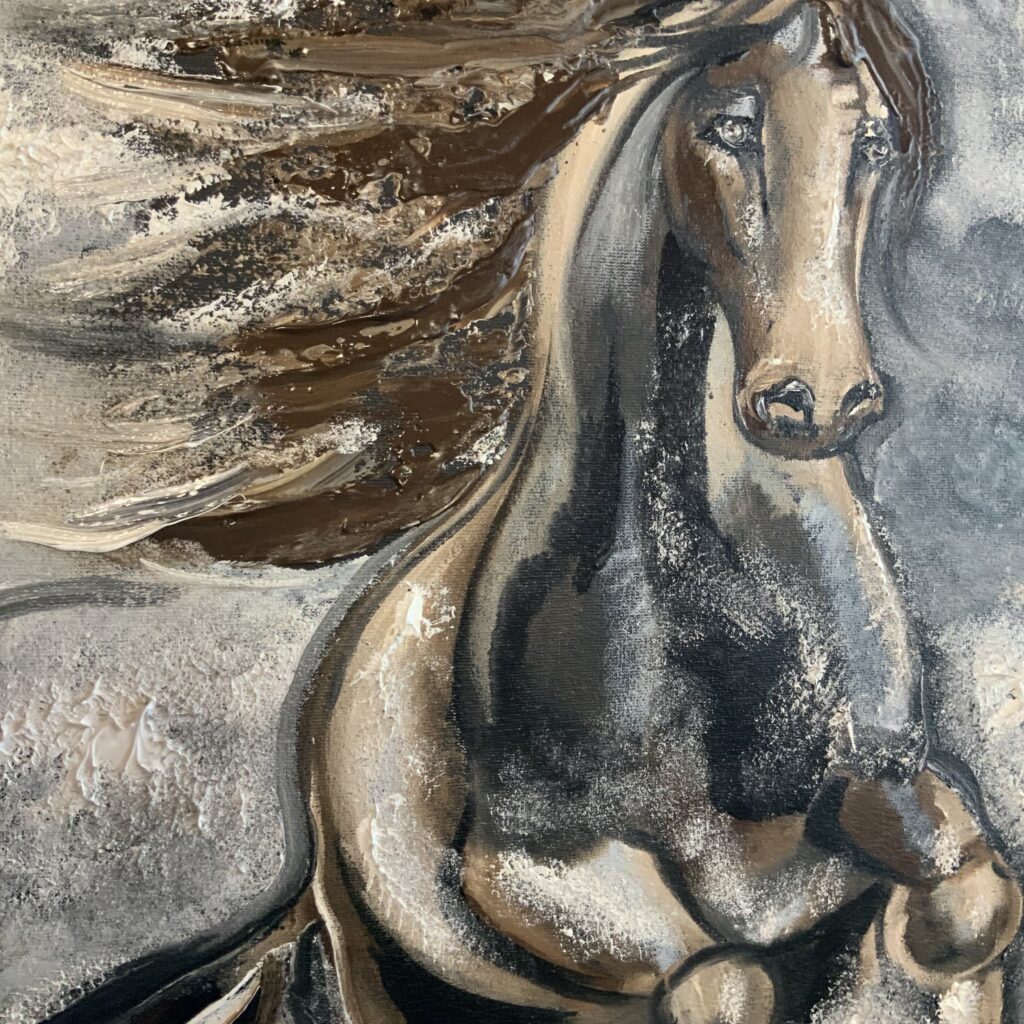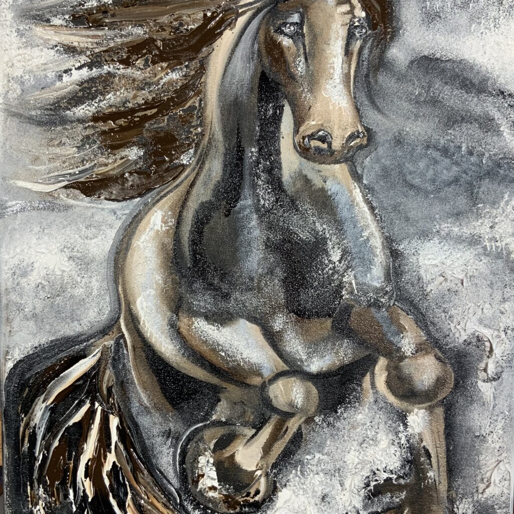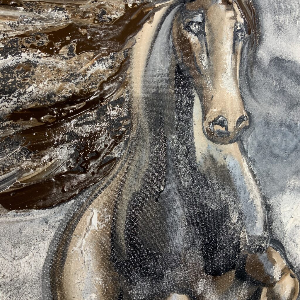 Хід коня - спокійний і захищає своєю багатоликою тишею, і лише удари потужних копит сили боротьби і протистояння негативу - руйнують цю гармонію ходу і наповнюють новою філософією руху до подолання перешкод зовнішнього характеру.