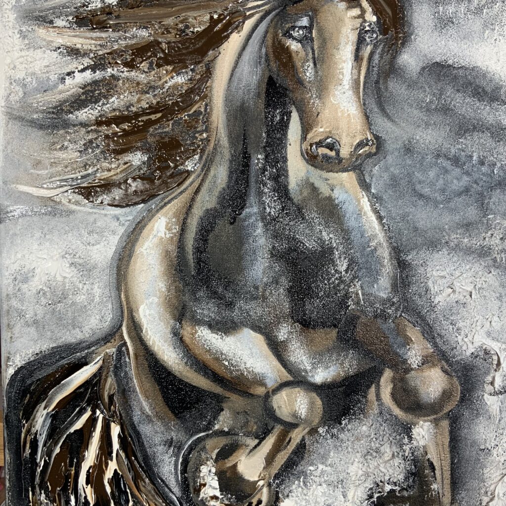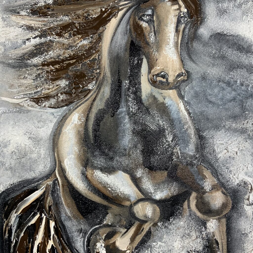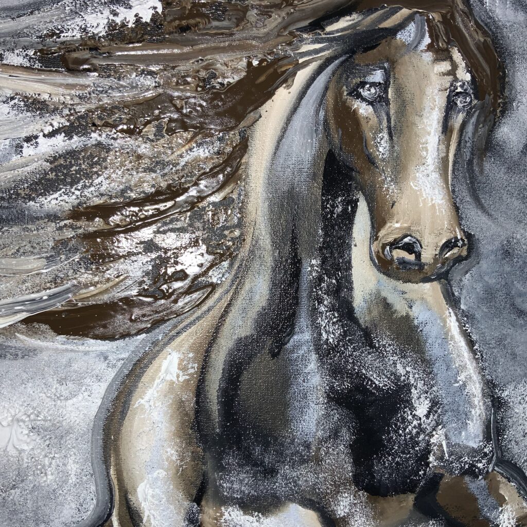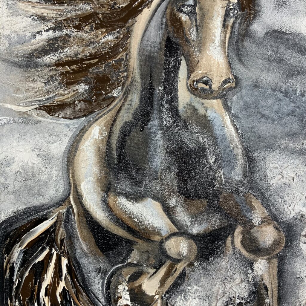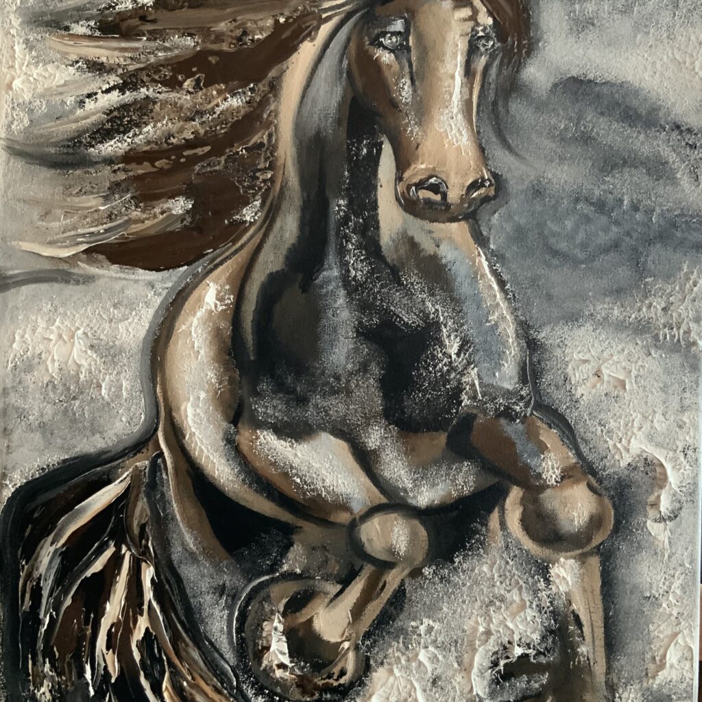 Хід коня - спокійний і захищає своєю багатоликою тишею, і лише удари потужних копит сили боротьби і протистояння негативу - руйнують цю гармонію ходу і наповнюють новою філософією руху до подолання перешкод зовнішнього характеру.